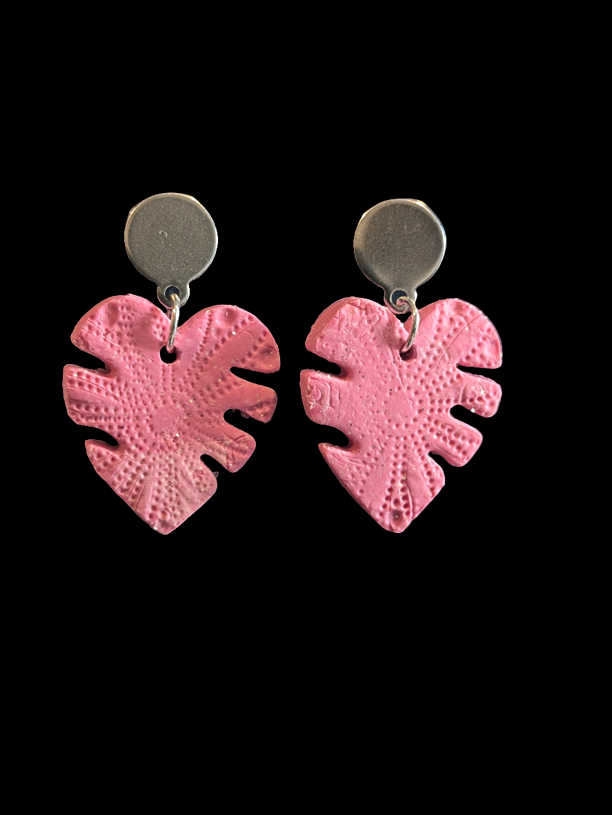 Handmade pink palm leaves with a slight trxt and glitter on stainless steel post.