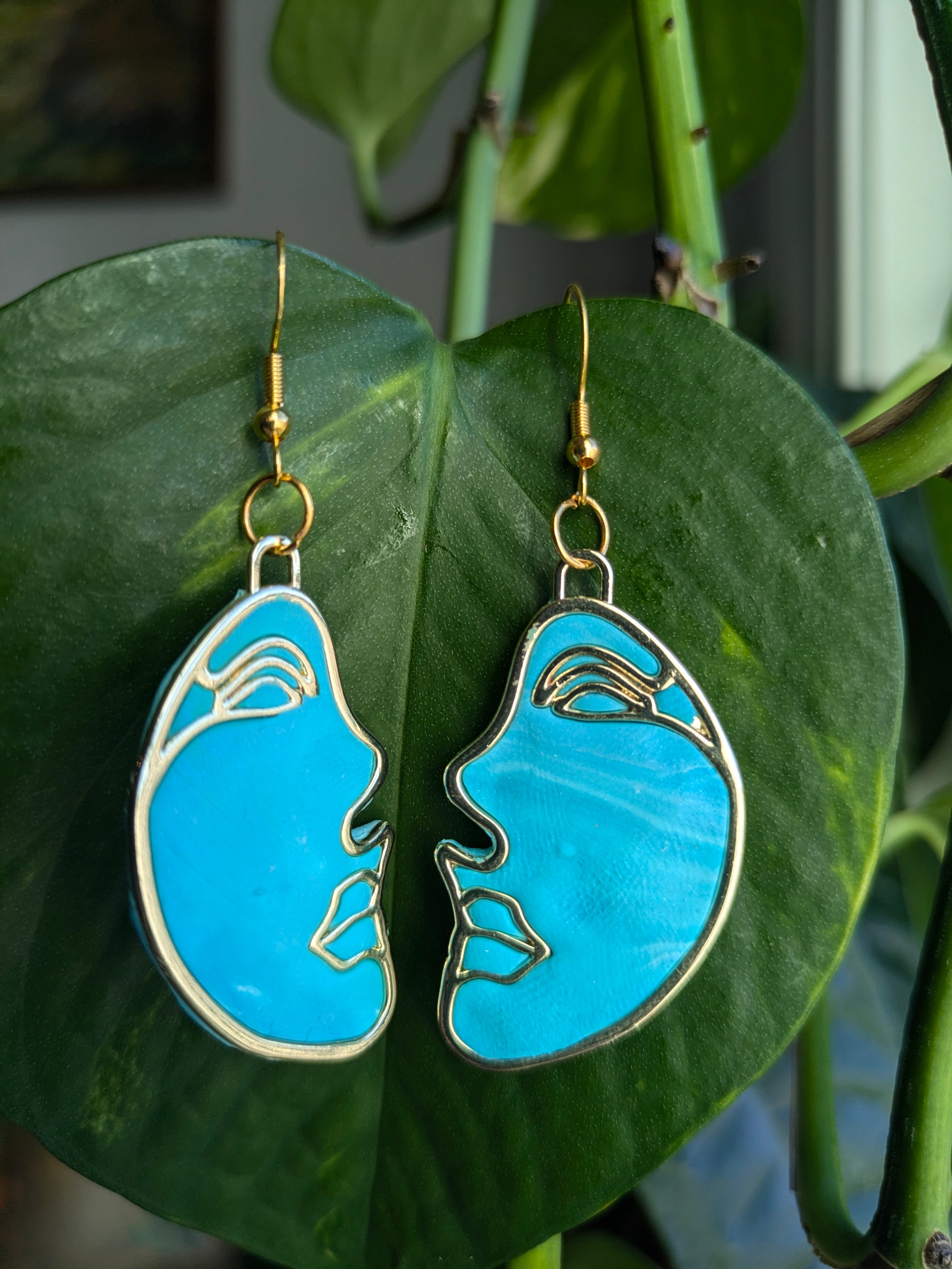 Gold plated stainless steel embedded on teal polymer clay with gold plated stainless steel hooks.
