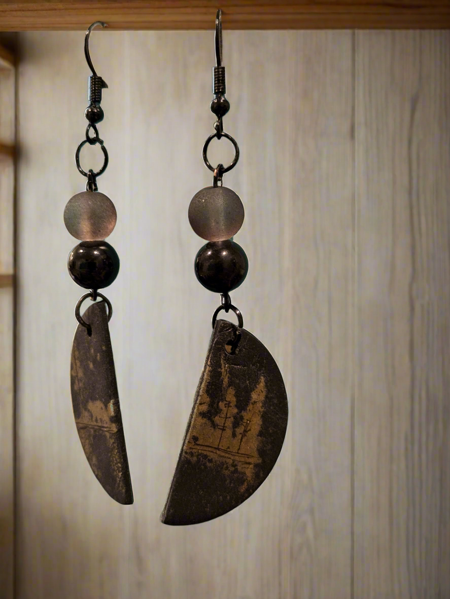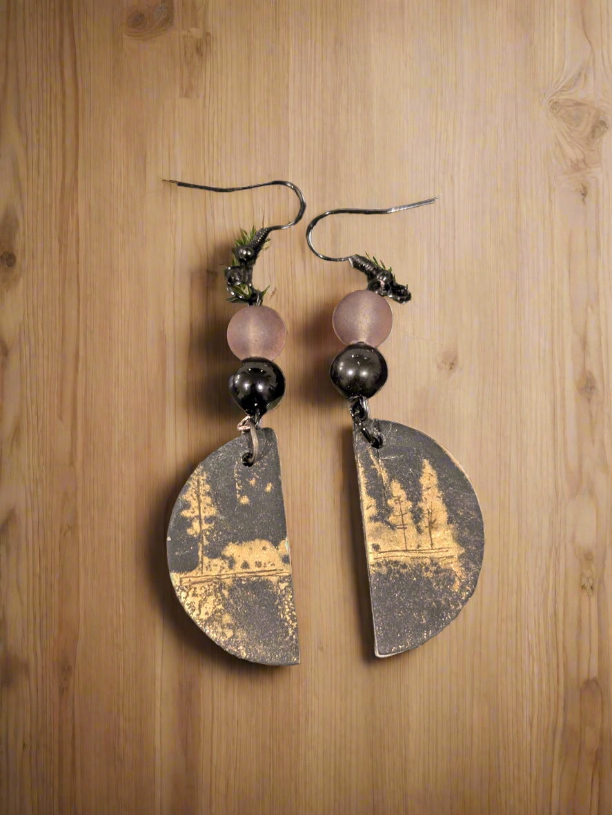 Black polymer clay with gold painted woodland scene at night. Black obsidian beads and smoky gray glass beads.